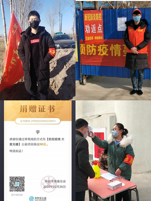 为深入贯彻习近平总书记对新冠肺炎疫情防控工作的系列重要指示精神,落实党中央决策部署以及学校工作要求,充分发挥青年志愿者服务社会的作用,临床学院2016级临床医学本科第六志愿服务队于2020年2月以来以线上和线下相结合的方式开展“心手相牵战疫情,牢记使命勇担当”主题志愿服务活动,以实际行动为打赢新冠肺炎疫情防控这场人民战争、总体战、阻击战贡献青春力量。 提高站位,勇于担当 自疫情发生以来,临床学院2016级临床医学本科第六志愿服务队志愿者积极配合学校相关规定,志愿者们密切注意自身健康情况,做到“日报告,全排查,真核实”,以实际行动展现一名新时代的青年志愿者的担当。志愿服务队成员张晓玲、张吉烨和吴旭发等积极主动加入家乡防疫检查站做应急志愿,登记出入人员信息、测量体温、管控人员进出,在实际行动中亮身份。众志成城,共克时艰,数名志愿服务队队员奉献爱心,为湖北疫区捐款,小小力量汇聚青春正能量,展现新时代青年志愿者的风貌。