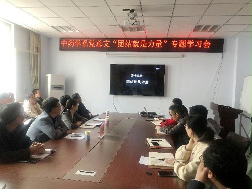 中药学系党总支召开“团结就是力量”专题学习会 周文娟要求,各党支部要以此次专题学习会为起点,召开支部党员大会、党小组会传达学习,做到原原本本学、逐字逐句学、创新方法学、深入细致学,迅速将总书记的亲切关怀、肯定勉励和殿切期望,传达到每一名党员。