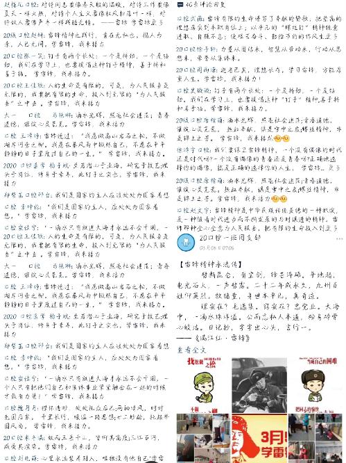 线下志愿者活动 接力雷锋语录,讲述雷锋故事 本支部官方QQ于雷锋日发布《雷锋精神永流传》内容,本支部成员转发并自行配雷锋语录,接力雷锋精神,增强使命感。高昂、祁琳、李可心等二十名学生借助喜马拉雅FM共同完成视频《回望你的那些年》和《雷锋日记》,讲述雷锋的一生经历与其思想,将雷锋高大无私的形象生动呈现,从雷锋事迹中找寻雷锋精神,从雷锋精神里学习青年担当。