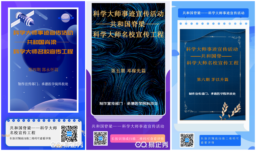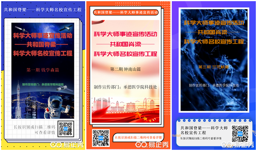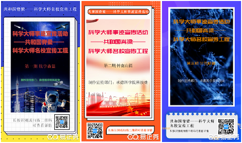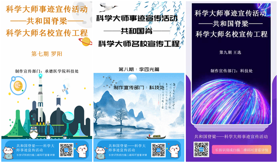 科技处深入学习贯彻习近平总书记关于党史学习教育、科技创新重要论述和重要指示批示精神,按照学校安排部署,围绕“我为群众办实事”实践活动,锚定学校“十四五规划”重点任务和医科大学建设目标,持续提升学校科技创新能力,推进学校科技平台建设,强化学术学风建设,推动科技领域党史学习教育走深走实,为学校建设医科大学提供新动能。 加强科研道德和学风建设,推出“共和国脊梁—科学大师宣传”系列活动 为进一步弘扬科学家精神,加强科研道德和学风建设,2020年12月-2021年6月,科技处推出“科学大师事迹宣传、共和国脊梁—科学大师名校宣传工程”系列活动,制作了钱学森、钟南山、竺可桢、郭永怀、邓稼先、茅以升、罗阳、李四光、王选等9位为我国科技事业做出巨大贡献的老一辈科学家的宣传片。每月制作一期,在学校科研交流群定期发布,组织学校科研人员开展学习和研讨。号召全校科研工作者学习老一辈科学家把自身事业追求和人生价值追求同国家富强、社会进步、人民幸福联系起来的感人事迹和崇高品质。本次宣传活动引导我校科技工作者自觉践行社会主义核心价值体系,弘扬了爱国、创新、求实、奉献、协同、育人的崇高中国科学家精神,营造了良好学术生态! (点击文中每张图片即可查看其大图)