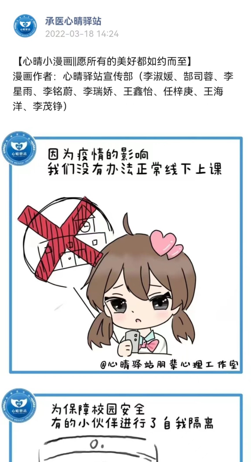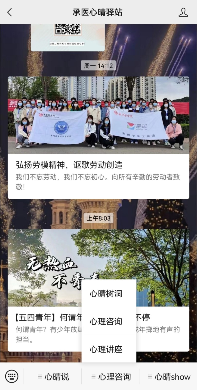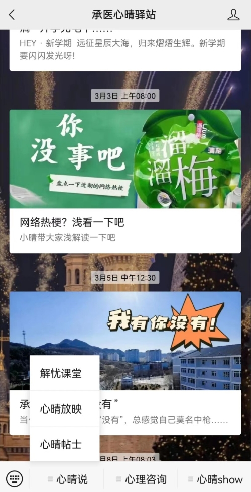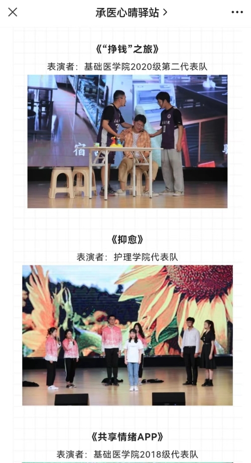 报道来源:中国大学生在线 报道原文如下: 承德医学院打造“心晴云端”品牌,通过“云端”普及积极心理健康教育、开展丰富有趣的心理健康活动,将爱与服务输送到学生身边。 伴随5G网络的普及和互联网+在高校教育教学中的应用普及,为通过新媒体开展心理健康教育奠定了坚实基础。为切实做好疫情防控工作,全国多所高校实行校园静态运行管理。校园静态运行管理期间,学生比较容易产生焦虑、紧张等情绪问题,同时可能会增加或激化部分原有心理健康问题或困惑学生,引发心理危机。此外,静态运行管理给学校原本面临的如心理健康教育专业师资紧缺、传统心理咨询在时间场地等方面限制受众面小、心理健康教育活动开展实效性等方面增加了困难和挑战。因此,“云端”心理健康教育应运而生,承德医学院打造“心晴云端”品牌,开拓心理健康教育工作新局面。通过“云端”普及积极心理健康品质教育、开展丰富有趣的线上线下联动心理健康活动、依托“云端”预约心理线上咨询等,将爱与服务从“云端”输送到学生身边。 心晴“云端”,聚焦普及积极心理知识,花式推送到身边 传统心理健康教育较多关注心理健康异常情况,较少从积极心理学视角出发,开展积极情绪、幸福观、和谐人际关系等普适性教育引导。面对疫情复杂多变情况,依托新媒体开展积极心理健康教育,作用突显。承德医学院多年来坚持培养学生积极向上的心理素养,一方面从纵向上抓好学生工作队伍、心理委员培训线上培训,提高心理健康教育和朋辈心理辅导的专业性;另一方面依托心晴“云端”,结合微信公众号、视频号、抖音号等新媒体,设计心理微课、暖心小贴士、心理健康生活指南、幸福观、恋爱观等积极心理健康微课、推文,定期及时推送全体在校生,用同学们喜闻乐见的图片、短视频、网文等网络新媒体作品,通过心晴“知”、“述”、“烩”、“show”、“录”、“约”6个板块,结合互联网+,普及宣传心理健康知识。 心晴“云端”,聚焦个体团体心理咨询,多样服务到身边 一直以来高校心理健康教育存在专业师资较少,一对一心理健康咨询受众面小,受时间、地点等因素限制性强等困扰。5G时代的到来给运用互联网+新媒体开展线上心理咨询相关功能提供了新的机遇和挑战,促进心理咨询更加快捷、便利和广泛开展。承德医学院心晴“云端”针对疫情期间封闭管理,上线心理咨询线上筛查、分类、预约和咨询等功能,尤其是通过线上预约团体心理辅导,可以有针对性的为申请班级定制团体活动,从自信心、自我悦纳、和谐人际关系、班级凝聚力等多个主题设计活动方案,形成班级“专属”团体方案,不仅提高了同学们参加心理活动的兴趣,更增强了团体心理辅导的有效性和普适性。 心晴“云端”,聚焦问题困惑心理需求,温暖关怀到身边 青年大学生在心理发展阶段中处于成年早期,心理的发展内涵不断丰富,需要完成自我同一性的确立,且仍具有两极性的特点,需要人际关系支撑,尤其是需要倾诉、宣泄和共情、有效反馈等。承德医学院心晴“云端”,依托微信公众平台,设立“心晴树洞”,多年来坚持线上“云对话”,让同学们尽情倾诉内心、宣泄情绪,并针对共性问题开设“解忧小课堂”、“心理健康沙龙”“心晴信箱”等模块,为同学们答疑解惑,解决问题。疫情校园封闭运行期间,有效针对隔离学生开展“暖心打卡”“纸传温情”等有温度的活动,运用手写信、心理小书签等将温暖与关怀送到学生身边,提升心理健康教育的温度。每年在学生入学、考研等关键时间节点录制加油视频,在疫情学校封闭管理期间制作《我在校园里·我很安全》抗疫原创视频等作品,师生纷纷转发,引导学生助力校园抗疫。 心晴“云端”,聚焦成长悦纳心理素养,专业测评到身边 心理健康教育是高校学生思想政治教育的重要内容,同时也是学生日常管理的重要模块。面对社会信息化、教育技术改革等背景,精准测评学生心理健康水平,建立全面、科学、便捷的学生心理健康台账,持续追踪学生心理健康情况,有针对性开展学生心理健康素养培养,是目前心理健康教育改进的方向。承德医学院心晴“云端”,通过学生工作平台管理录入特殊学生心理健康情况、每月统计学生个体、集体心理健康报表,逐步开放学生阶段性心理困惑、心理问题上报功能,除新生心理健康全面普测,还增加关键年级、关键时间节点专业性心理健康测评,提高学生自己和辅导员老师对学生心理健康成长的实际需求,如具体对不同学生存在人际困惑、家庭矛盾、学业问题等针对性进行心理素养培养,提升心理健康教育的精准度。 心晴“云端”,聚焦寓教于乐心理文化,精彩活动到身边 不断挖掘校园心理文化内涵,用学生们爱看、爱听、爱参与的方式,开展心理文化普及工作。承德医学院打造心晴“云端”心理育人平台,建设心理精品活动品牌。心晴“云端”,把心理健康教育活动主阵地从线下迁移,采用线上线下相结合的方式,让传统心理健康教育活动焕发新的生机和魅力,通过原创“心晴抗疫小漫画”、“抗疫手语舞”短视频大赛、线上线下联动“校园彩虹跑”、“线上情景剧”大赛等活动,潜移默化的让积极向上的生活学习理念深入人心。尤其是线上心理情景剧,原有以院系、班级为单位参加转变为以宿舍、自愿组