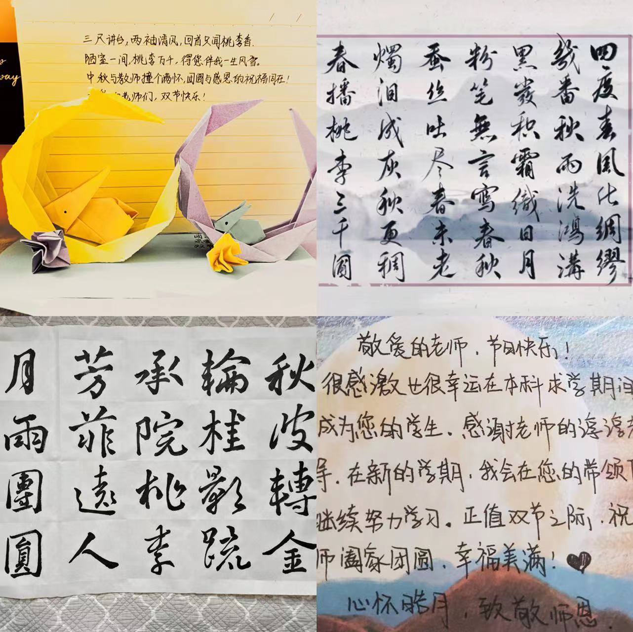 文案祝福 本次“书香沐中秋,桃李竞芳菲”主题系列活动的成功开展,丰富了学生们的课余文化生活,营造了尊师重教的良好氛围。这些内涵丰富、形式多样的系列活动,激励着我校学生传承优良传统,厚植爱国情怀,矢志砥砺奋斗,以昂扬向上的精神面貌迎接党的二十大的到来!