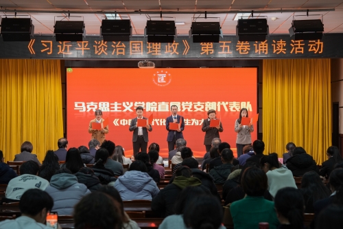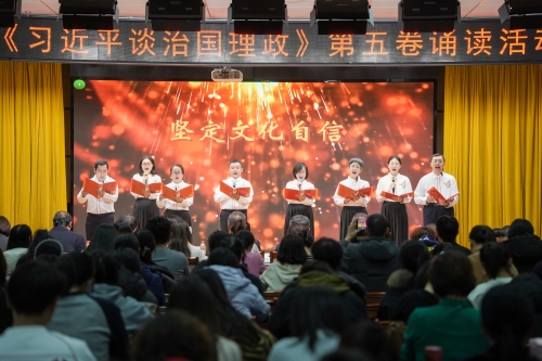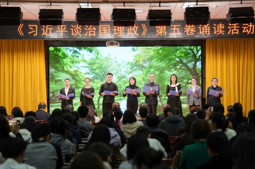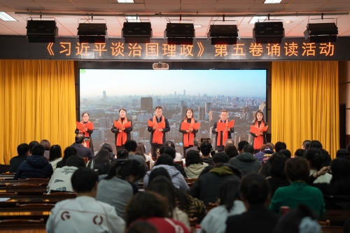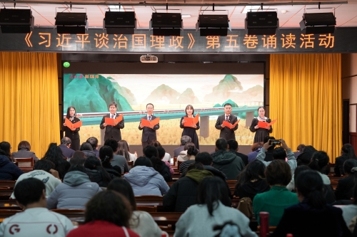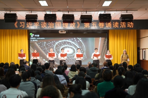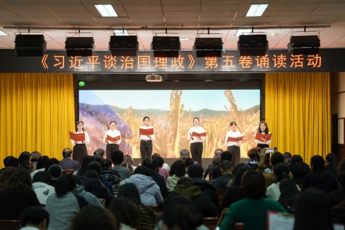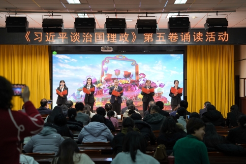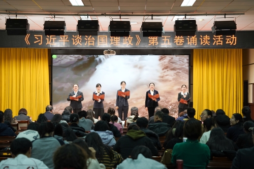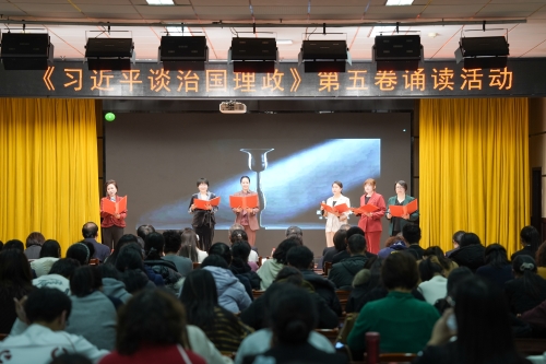 为深入学习贯彻习近平新时代中国特色社会主义思想,用党的创新理论武装师生头脑、指导实践、推动工作,12月11日我校在图书馆8楼多功能厅举办《习近平谈治国理政》第五卷诵读活动。