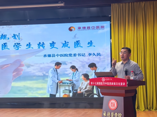 承德县中医院党委书记李久民做宣讲 整场宣讲内容详实、针对性强,有效解答了学生在职业规划中的困惑。参会学生认真听讲、仔细记录,展现出优良学风与精神风貌。 此次活动是中医系第十七届国医节的重要组成部分,进一步搭建了政策与青年学子的沟通桥梁,增强了学生对中医药事业的认同感与责任感。未来,中医系将紧扣“十五五”规划与医科大学建设目标,持续开展政策宣讲与文化传承活动,助力学生成长成才,为中医药事业高质量发展贡献承医力量。